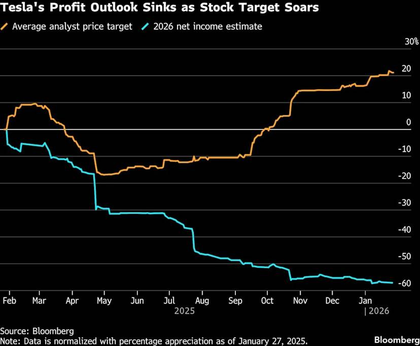 Well, Tesla’s Wall Street analysts’ 2026 projections (courtesy of Bloomberg) would suggest (at least for now) that it will, and then some (this degree of divergence between earnings and price projections is certainly not something you see every day):
