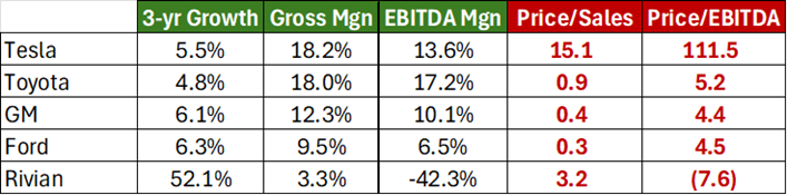 For years, Tesla enjoyed the rare combination of explosive growth (41% annually from 2019 – 2023) and exceptional operating efficiency (gross and EBITDA margins at or well ahead of industry leaders). For years, Tesla has also traded at a truly staggering premium relative to its auto manufacturing peers. While its price-to-sales and price-to-EBITDA multiples were hard to justify even with the exceptional performance, at least there was exceptional performance to point to.